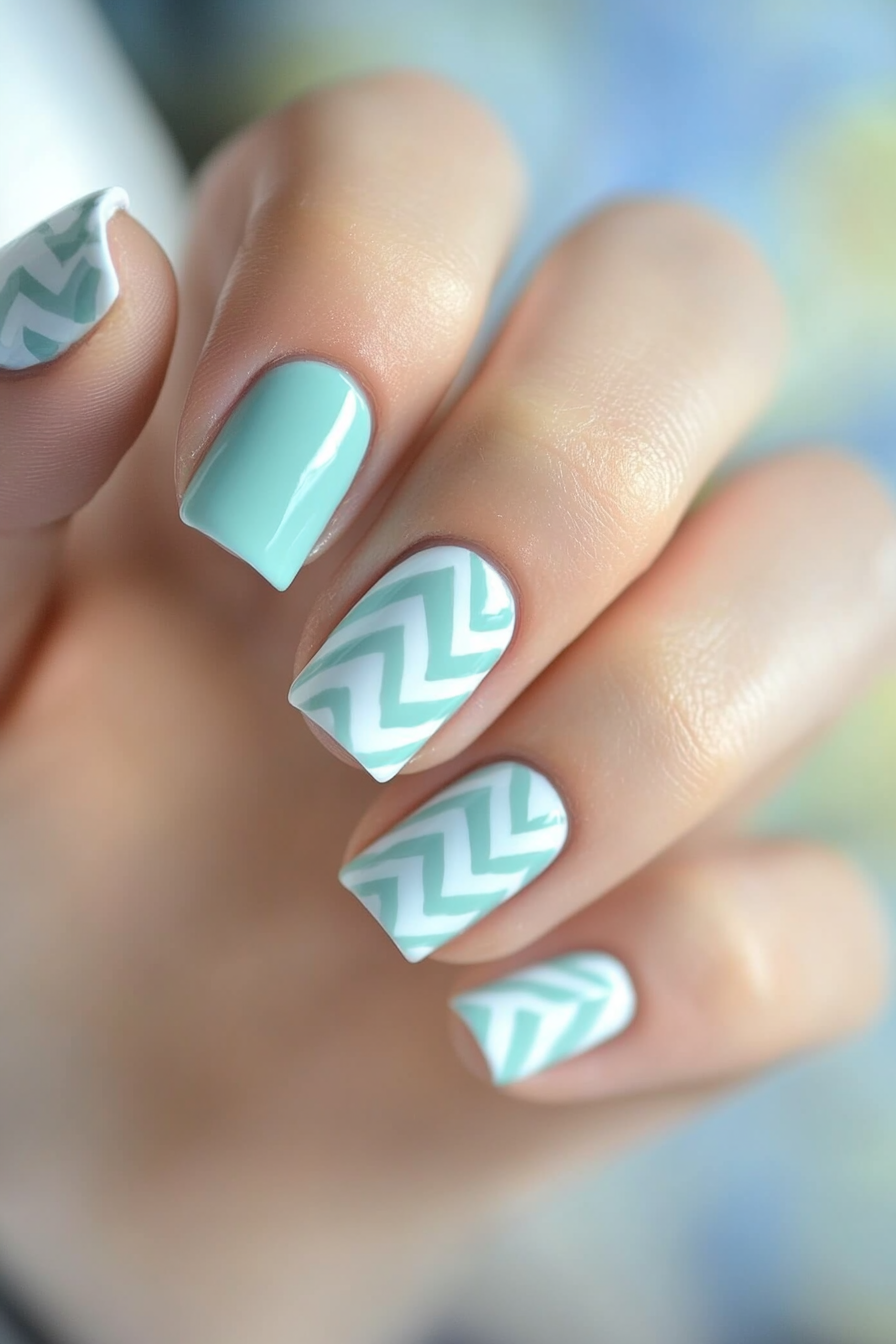 Mint green nails adorned with subtle leaf designs in white or light green provide a fresh, nature-inspired aesthetic. Perfect for those looking for a soft, botanical look.