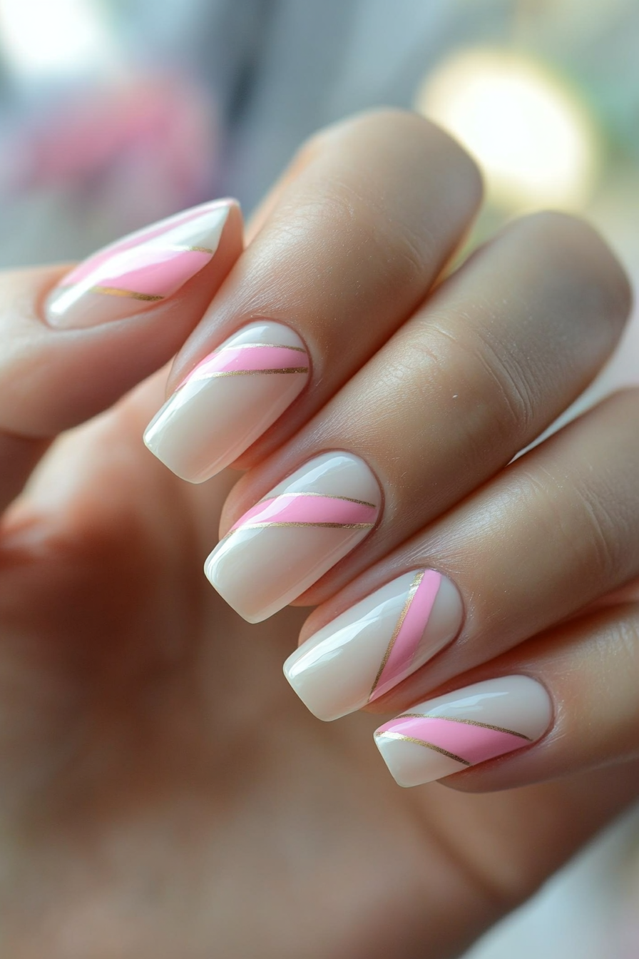 A creamy beige base with a thin pink stripe going diagonally across each nail is simple but stylish. A sleek design for any occasion.